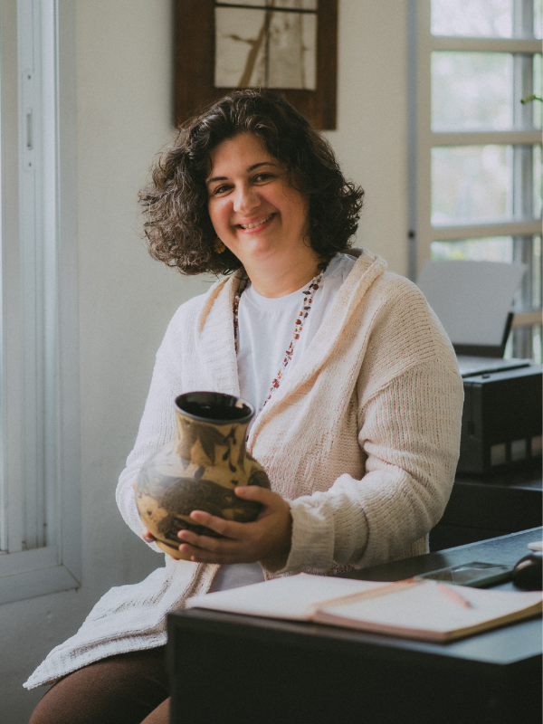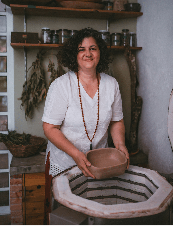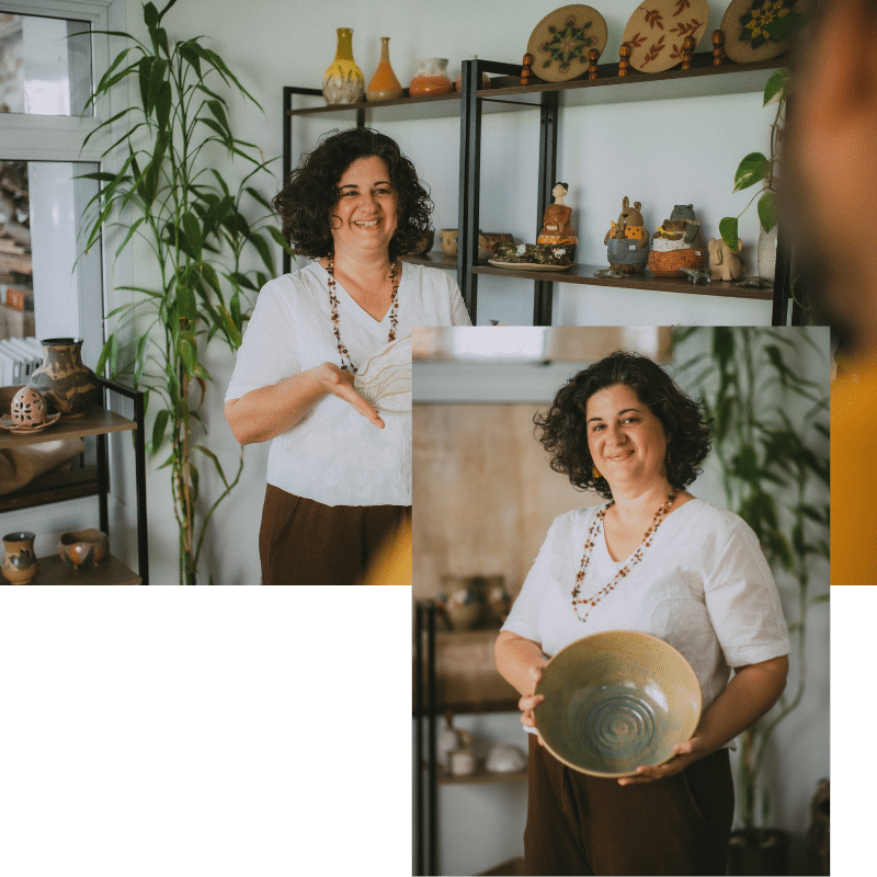 Formada pelo Instituto de Artes da Unesp, e aluna de grandes mestres da cerâmica, o saudoso Mestre Lelé e a ceramista Sueli Massuda.